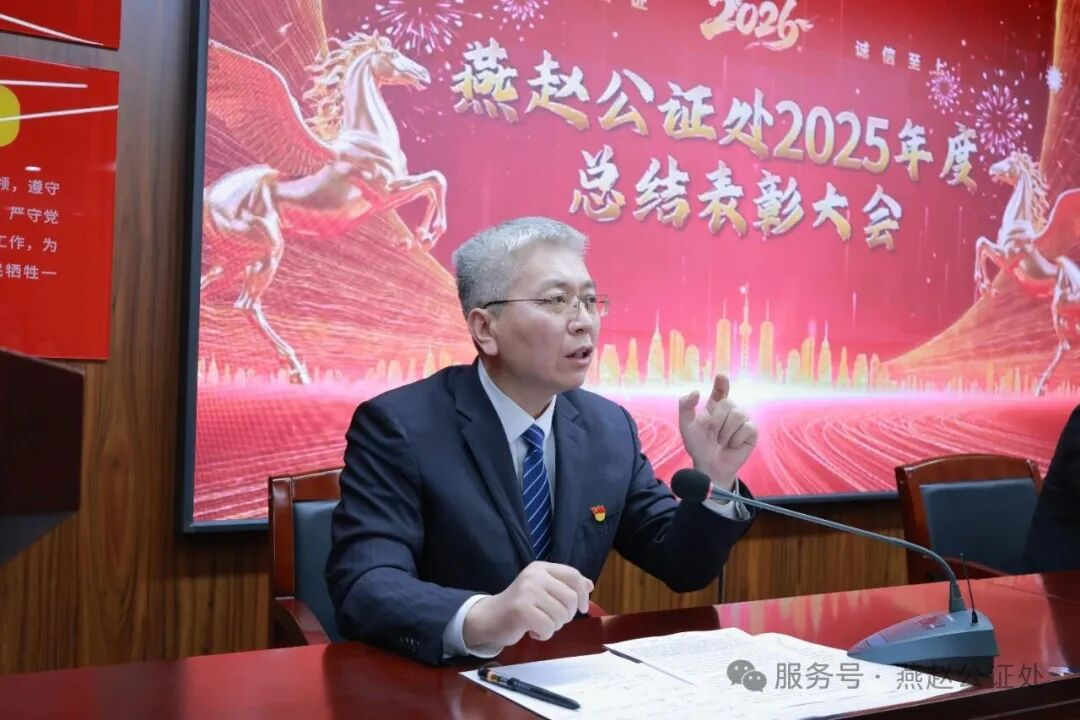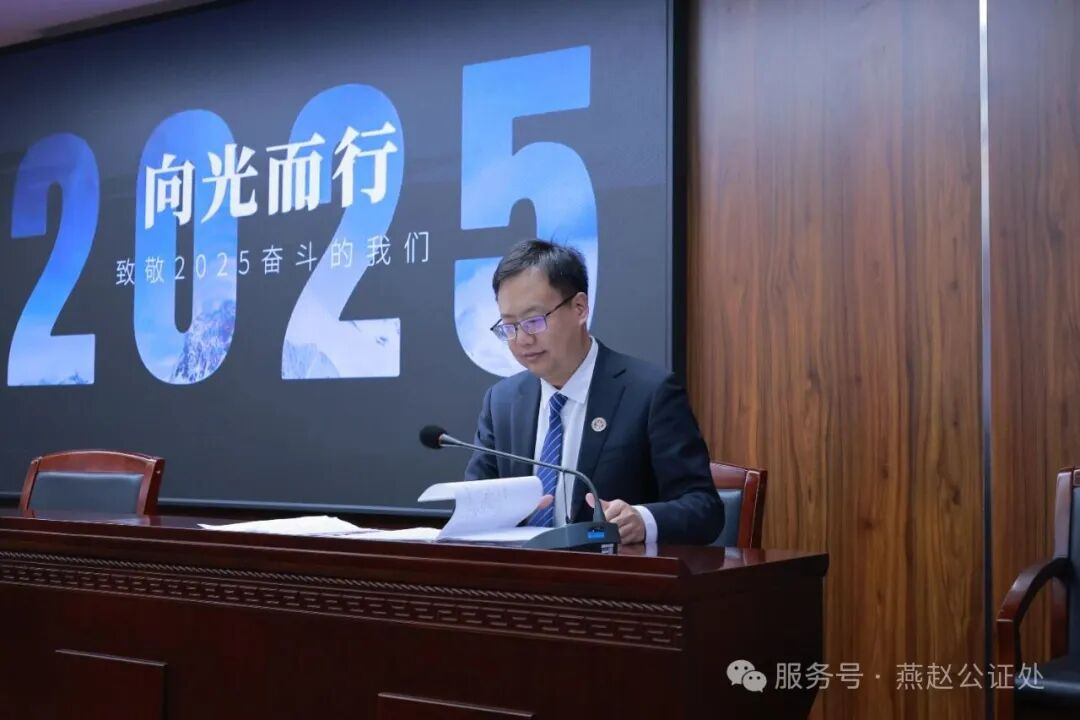 2025年,我们以匠心守初心,以优质践使命。王松主任深情寄语燕赵公证处的每一位公证人员,他强调,新的一年,全处上下要立足岗位、拼搏担当,以“开局即冲刺、全年都发力”的奋进姿态,在推动业务稳步增长的同时,持续提升服务品质,努力让高效便捷的公证服务惠及更多群众,为“十五五”良好开局贡献公证力量。
