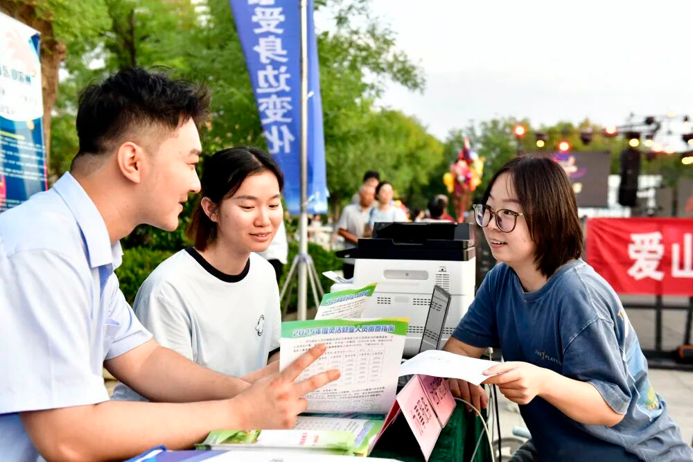在山东省滨州市惠民县孙武广场,人社局的工作人员向市民介绍社保证明查询相关服务(2025年8月25日摄)。新华社记者 郭绪雷 摄