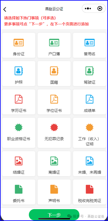 进入“涉外公证事项”,热门公证以九宫格形式清晰呈现,支持多选事项,实现一次性办理多项公证,避免前后切换,省时省力。